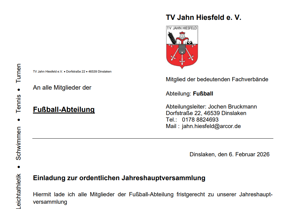 Einladung zur Jahreshauptversammlung an alle Mitglieder des TV Jahn Hiesfelds.
